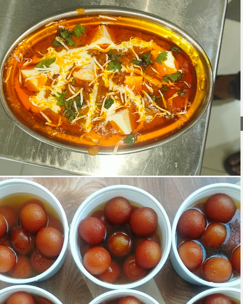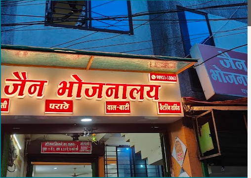 Jain Bhojnalaya is a clean, well-lit restaurant with a bright signboard, festive entrance décor, and a simple dining setup offering meals, parathas, sabzi–roti, and South Indian dishes.